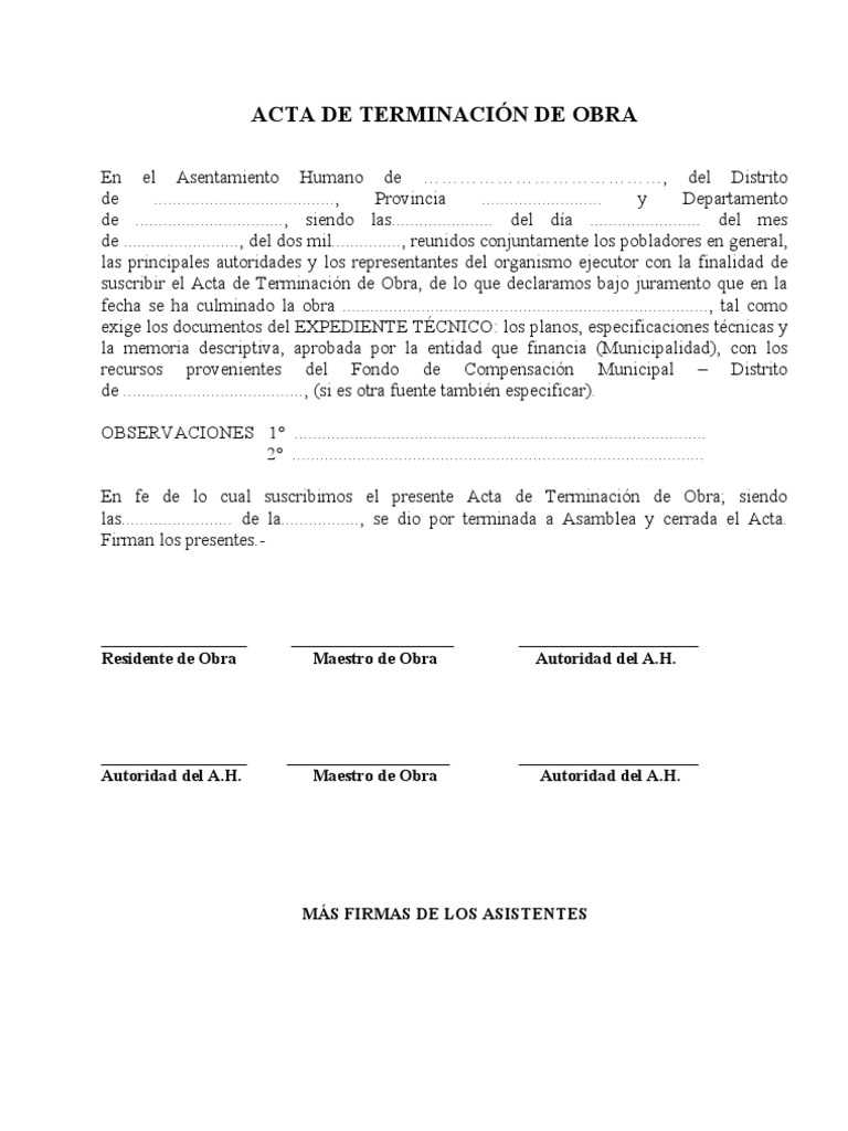 Modelo De Acta Terminacion De Obra via es.scribd.com